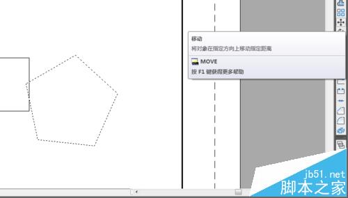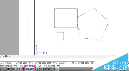 6、先选中你要移动的图形,然后点击【移动】。同时可将下方的【对象捕捉】打开(亮了即为开),此时将指针移至图形边上,有小正方形(或三角形或漏斗形)出现,左键点击,再移动时发现图形跟着指针移动了,当确认好移动最终位置时,再次点击,图形移动成功!