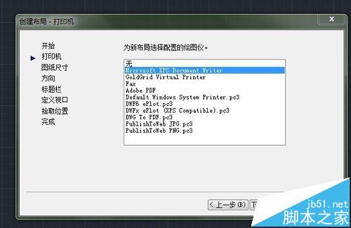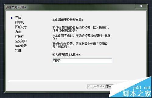 2、在“创建布局-开始”选项面板中输入新布局名,单击下一步按钮,打开“创建布局-打印机”对话框。