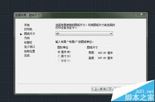 4、在该对话框中设置图纸的尺寸,在“图形单位”选项组中设置单位类型,然后单击“下一步”按钮,打开“创建布局-方向”对话框。
