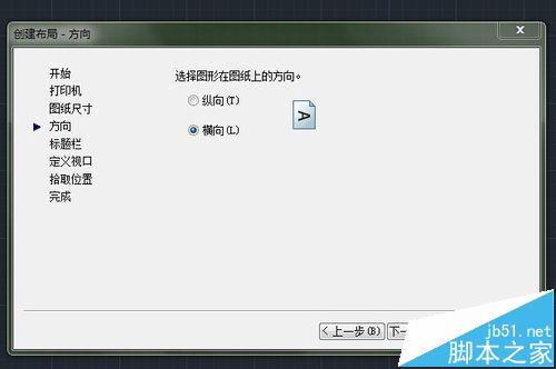 5、选中“纵向”或“横向”单选按钮,然后单击“下一步”按钮,打开“创建布局-标题栏”对话框。