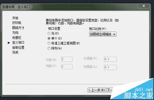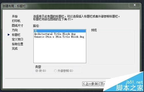 6、在该对话框中的“路径”列表框中选择需要的标题栏选项,然后单击“下一步”按钮,打开“创建布局-定义视口”对话框。