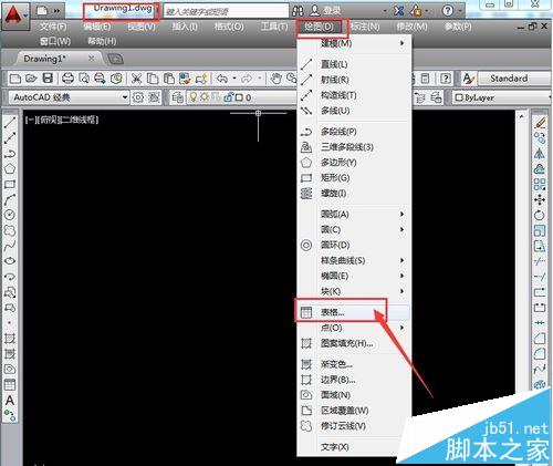 1、新建一个CAD文件,在打开的文件中,点击菜单项绘图,在下拉菜单中点表格