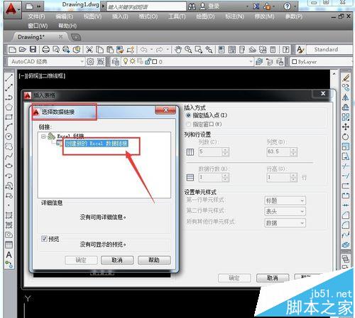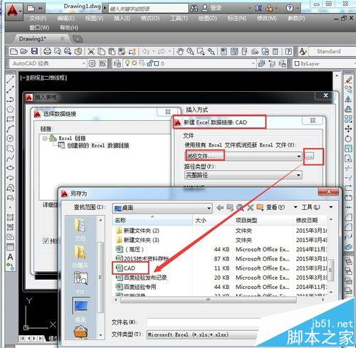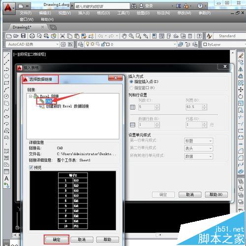 5、产生一个新建Excel数据链接:CAD对话框,文件从浏览中找到要链接的Excel工作表,
