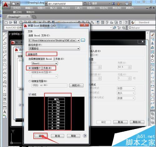 6、在链接选项中,我选择了整个工作表SHEET1,在下面有工作表中的数据内容预览,可以核实内容和表格形式,然后点击确定按钮