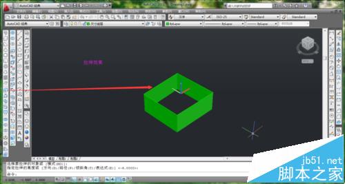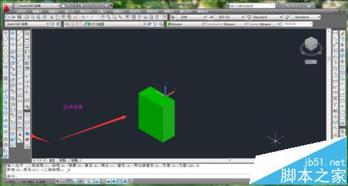 1、我们先使用长方形命令绘制一个长方形,调整到等轴测图模式,选择三维建模中的拉伸,指定高度,着色后效果如图所示,生成需要的实体。