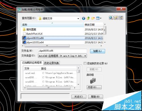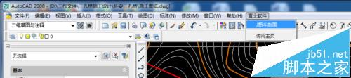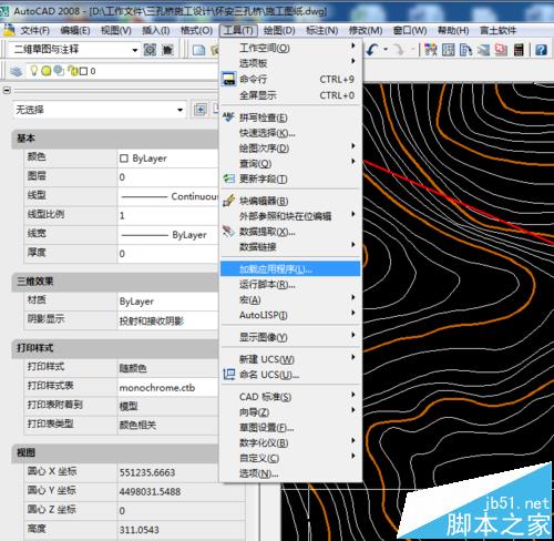 1、运行“CAD2008”,进入工作界面,将要切剖面的地形图打开。单击cad的菜单中的“工具”,选择下级菜单“加载应用程序”,跳出加载应用程序对话框(也可以在命令行中输入“appload或ap”,也可以打开加载应用程序对话框)。