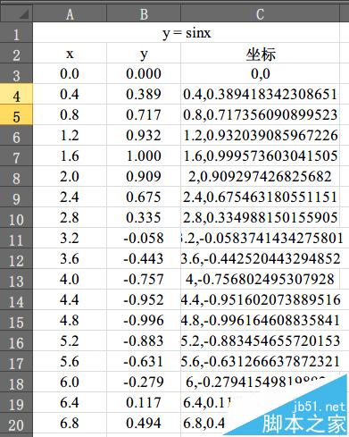 1、在A列从0开始以步长0.4(可自行调节)取若干个横坐标;在B3单元格输入“=SIN(A3)”,不包含引号,回车;在C3单元格输入“=A3&","&B3”,不包含引号,回车;同样方法填充B、C列其它单元格。