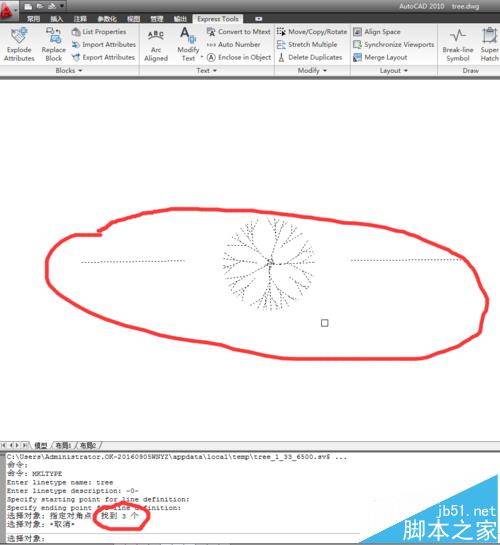 6、选择完ending point 后,开始选择对象,这里框选线和中间文字,命令行提示选中了三个。然后回车完成制作过程。