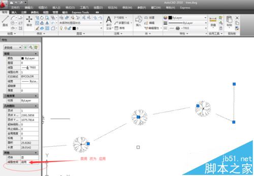 12、选好线型后,选择多段线命令绘制线如图。画完后如果显示一根线,没有中间的tree,这里可在特性面板里改变选中线的“线型生成”,将“禁用”改为”启用“。