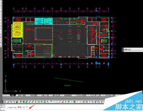 2、选中小区域的图形进行复制,看能选中的图形能否复制成功。通过下图可以发现选中16个图形,Ctrl+C的时候复制成功。命令行显示“显示命令: _copyclip 找到 16个”,证明是图形中的某条线或者图块有问题,找到引起问题的图形,自己新画图形代替就可以复制了。