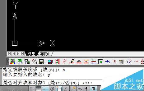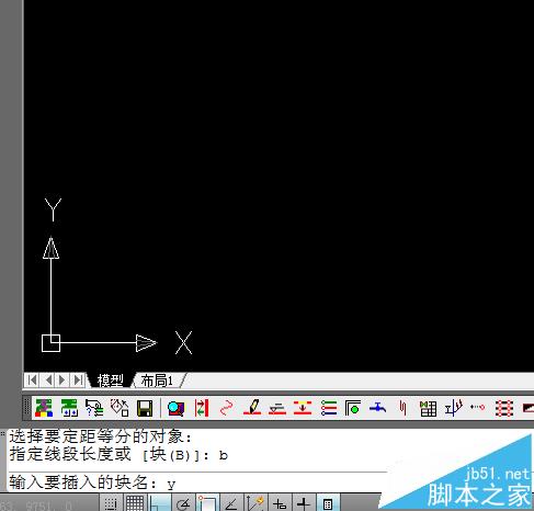 2、指定用于定距离等分的块,先输入“b”命令表示用块作为等分的对象。我们这里的块名字为“y”。