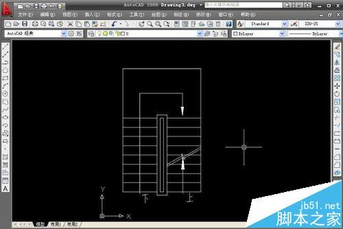 1、单击“绘图”工具栏中的“直线”按钮,再点开“正交”按钮,绘制楼梯的墙体与扶手,绘制完成进行下一步。
