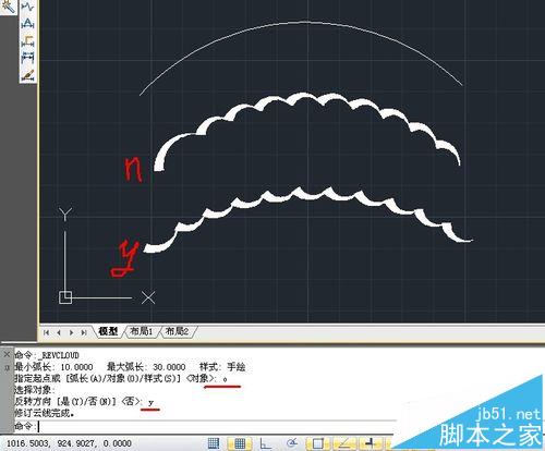 4、对象:点击云线命令后,输入O回车,点击图上的一条弧线,然后弧线会变成云线,这时不输入默认不反向,输入Y回车得到的是反向的云线。