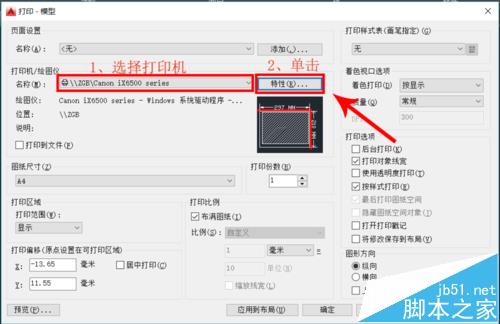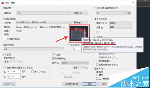 1、同时按住Ctrl+P,打开"打印"窗口。“图纸尺寸”选“A4”,将鼠标放到图纸示意图上,会浮现出说明文本。