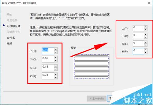 3、弹出“自定义图纸尺寸窗口”,将“上”“下”“左”“右”的值都修改为零,单击“下一步”。