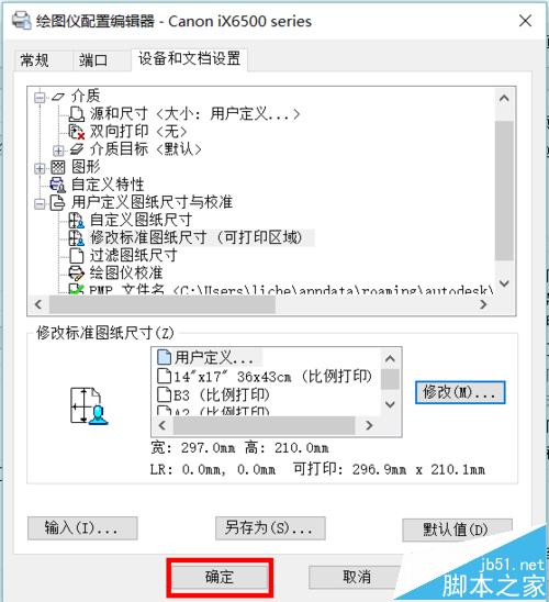 2、弹出“绘图仪配置编辑器”窗口,依次单击“修改标准图纸尺寸”——“用户定义”——“修改”。