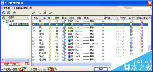 2、从上图中我们可以看出,图纸中共有131个图层,其中有37个图层是没有图形的空图层。在CAD高版本,默认不显示图层是否使用的状态,也就是SHOWLAYERUSAGE变量被设置为0,在这种情况下,“所有使用的图层”这个过滤器就不起作用了,如下图所示。