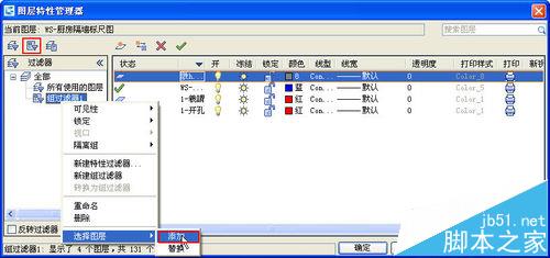 所谓“组过滤器”,就是不用设置过滤条件,由用户自己通过添加图层来定义的过滤器。我们可以将一些需要同时关闭、冻结或锁定的图层设置成一个组,设置好组后,直接在图层管理器中右键单击组名,就可以在右键菜单中选择开关、冻结或锁定这一组图层。组过滤器的定义方法很简单: