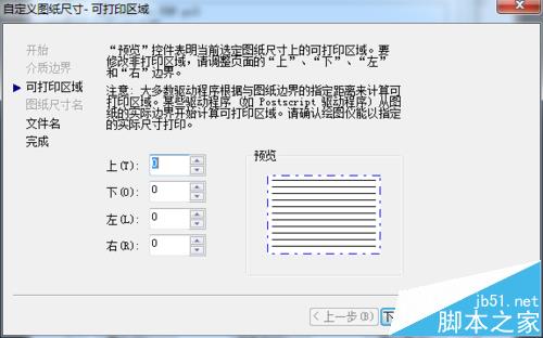3、单击【修改标准图纸尺寸(可打印区域)】。在【修改标准图纸尺寸】组合框中选择需要修改的图纸】,打开【自定义图纸尺寸-可打印区域】对话框。调整【上】【下】【左】【右】为【0】,单击下一步