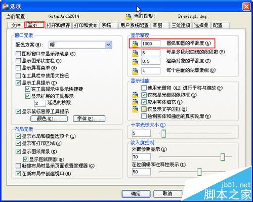 2、我们可以看到平滑度的默认设置是1000,有些CAD版本的默认值甚至是100,在这种设置下,通常圆、弧未突然被放大时也可以显示平滑。但有些人嫌经常重生成很麻烦,所以直接将平滑度设置成最大值20000。我不建议采用这种方法,原因有两个:一是如果图纸比较大且圆、弧比较多的时候,显示数据会增加很多,对性能有较大影响;二,即使设置成20000,圆和弧还是多边形显示,不能保证视图突然放大很多倍时圆和弧不会显示为多边形。这种方式只有在图纸比较简单,图形不太多时可以采用。
