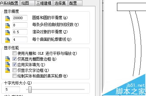 1、CAD中是可以调整圆和弧的平滑度的,平滑度设置越高,圆和弧使用的边数越多,这个参数最大可以设置成20000。我们可以直接输入VIEWRES,回车后在命令行设置平滑度,也可以输入OP,回车,在选项对话框的显示选项卡中设置平滑度,如下图所示。