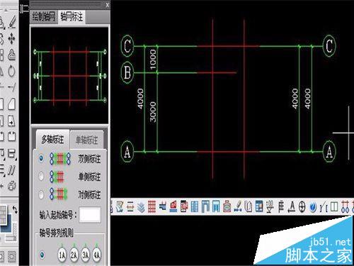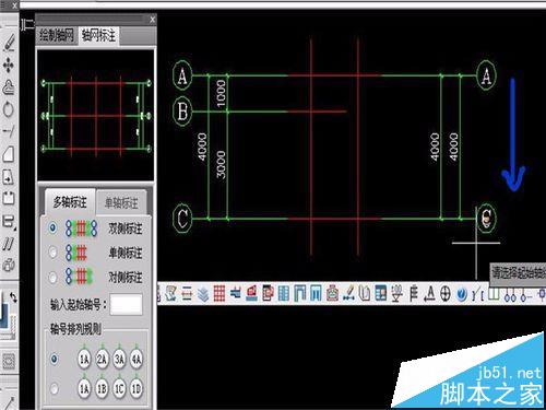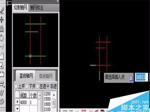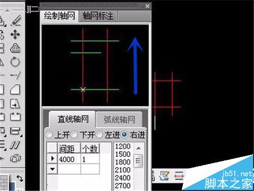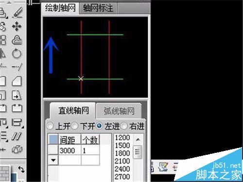4、下开是从下往上看,也是从左向右绘制。左右开就是以水平第一根默认线开始向上绘制。如图,在距离上一根线多少长度就输入多少,它就会在小窗口中显示出纵横交错的轴网