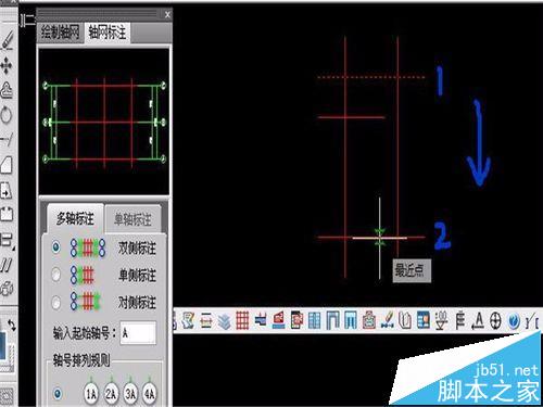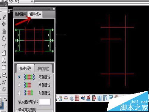5、将绘制好的轴网直接拖到右边,单击左键就会生成。然后,你在第二个选项,轴网标注上点击一下。看下默认的是不是双轴标注,如果不是就选中它