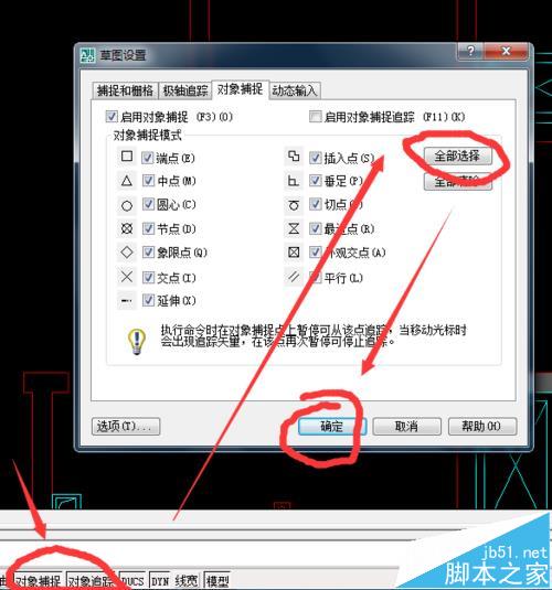2、首先设置捕捉。在对象捕捉或者对象追踪上单击鼠标右键,弹出对话框,全部选择,确定。