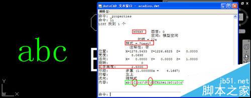 4、查询LI(LIST)其实跟特性面板效果差不多,但观察有些特性更方便。从查询特性可以看出来,类型是MTEXT多行文字、文字样式是TEST,字高是2.5,跟特性面板是完全一致的。只是在查询窗口中可以将文字内容完整的显示出来,上面文字的内容是:ab{\C1;c}\P{\fSTXihei|b0|i0|c134|p2;BC\H0.72x;D},我们可以看到在文字内容中添加了一些大括号,这些大括号中的内容就被修改了特性的文字,如果多行文字整体被修改了格式,这个大括号就可能从头括到尾。我们可以看到上面列举了几种格式符,\C表示设置了颜色,\C1表示颜色修改成了1号色(红色),\f表示修改了字体,后面跟的是字体的名字及一些相关的设置,\H表示修改了文字高度,0.72x表示是整体字高2.5的0.72倍,\P是换行,这个倒不用管。