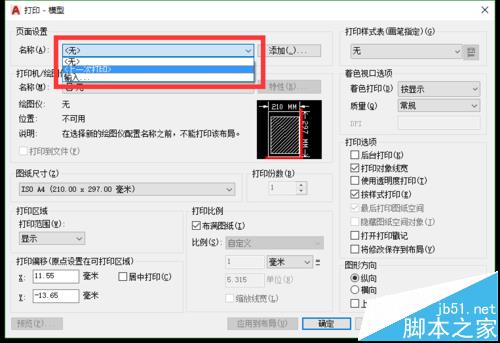 5、选择“打印机/绘图仪”的“名称”,在下拉类表中选中你的打印机。