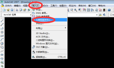 2、在2007版CAD菜单栏找到插入——光栅图像参照;