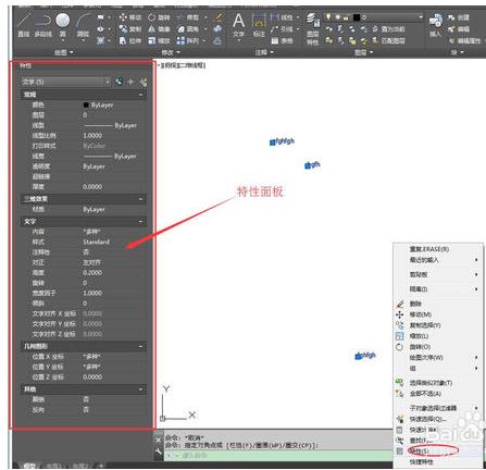 2、打开cad特性面板,菜单栏中修改>特性,或者选中文字右键>特性