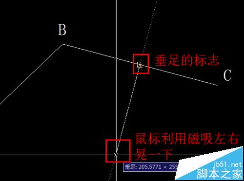 2、使用快捷键“L”直线命令,选择第一个点时,选择BC的中点;然后在垂直方向左右晃动鼠标会有如图所示的“垂足”出现,左击选择第二个点,OK!