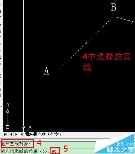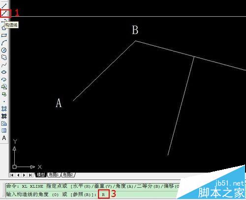1、输入XL或者点击“构造线”命令,按照提示依次选择角度A,参照R,选择直线,角度90度。如下图标识的步骤