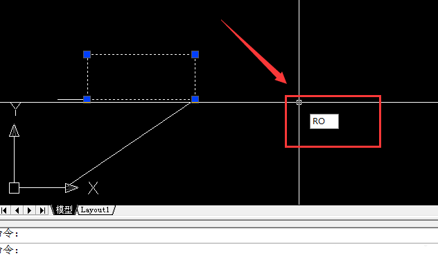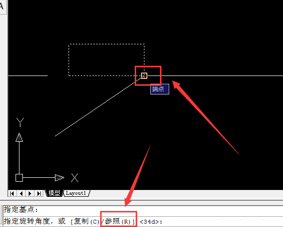 2、然后选中一个基点,如图所示,命令版上会出现命令,我们选择R,空格,如图所示