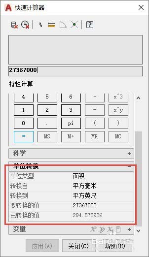 6、平方毫米到平方米这种转换,我们用口算都能算出来,用计算器还可以进行一些口算无法完成的转换,例如从平方毫米到平方英尺的转换,如图所示。