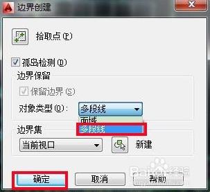 3、回车,这时,弹出边界创建的对话框,我们在对象类型里选择多段线,然后确定。