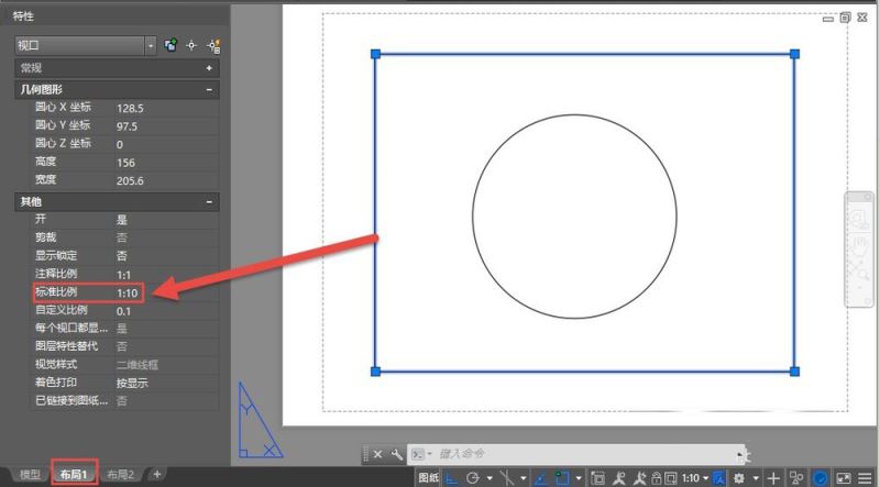 在模型空间绘制一个半径为500的圆后切换到布局空间,进入视口,按住鼠标中键,将圆平移到视口中心。在视口外单击进入图纸空间,单击选中视口,将视口比例设置成1:10,如图所示。