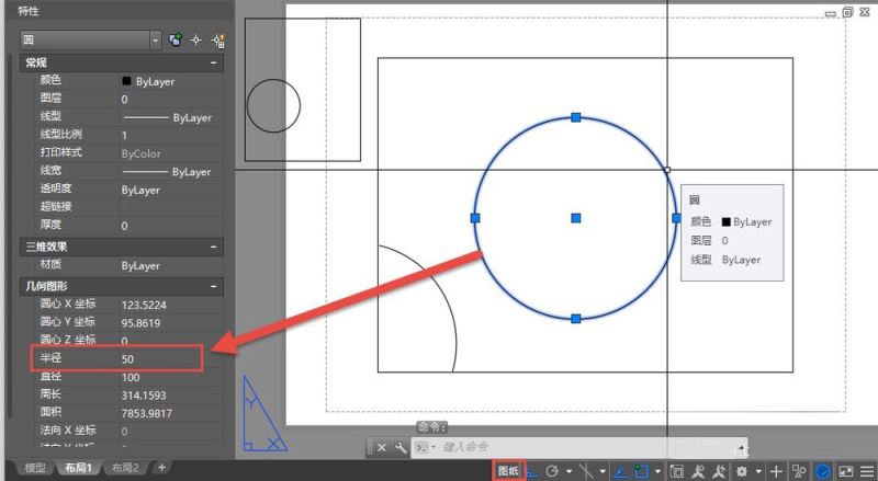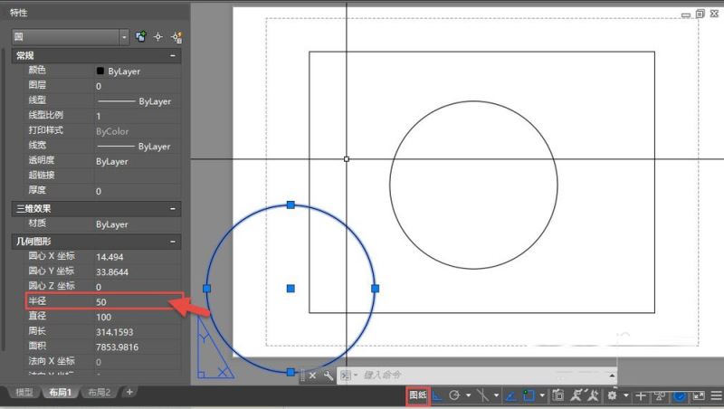 2、这时在图纸空间画一个圆,圆的半径设置为50,如图所示。由于视口比例是1:10,我们可以看到视口外图纸空间半径为50的圆跟视口内模型空间的半径为500的圆是一样大的。