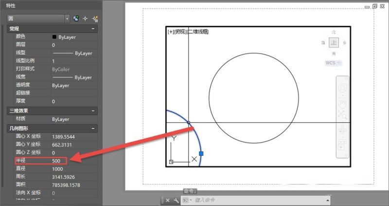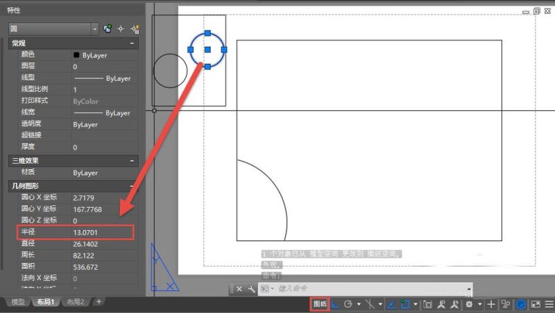 3、先选择图纸空间的圆,在菜单或面板中执行更改空间命令,或直接输入CHSPACE后回车,如果布局中只有一个视口,圆就会自动变到这个视口内,而且圆的半径会自动乘上视口比例,变成500,如图所示。