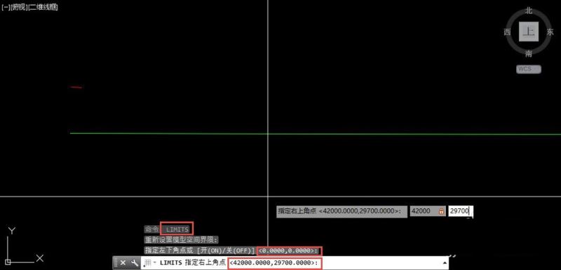 根据我们需要的界限大小来指定右上角点的坐标,假设我们的图形最后是要1:100打印到A3的纸张上,就需要将左上角设置为42000,29700。