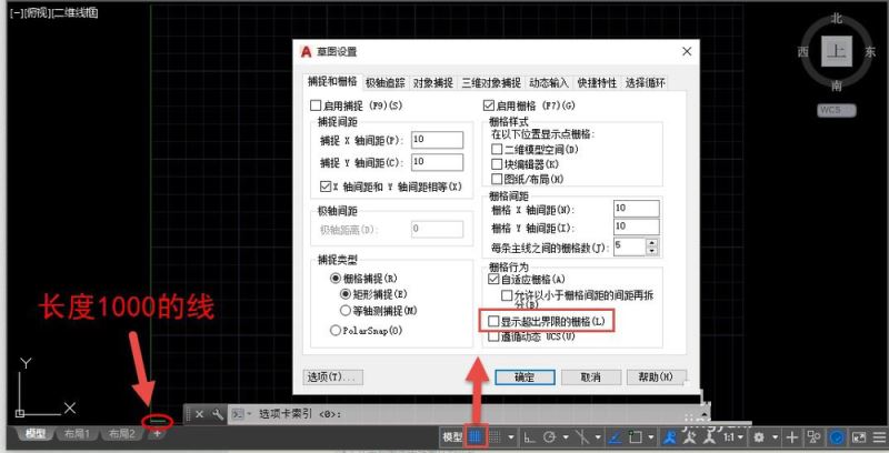 如果你的CAD版本较低,栅格还是用点显示得话,你把栅格打开,可以看到栅格点显示范围就是图形界限的范围。如果是高版本,需要在栅格设置对话框中取消勾选“显示超出界限的栅格”,才能通过栅格线实实在在地看到图形界限,如图所示。