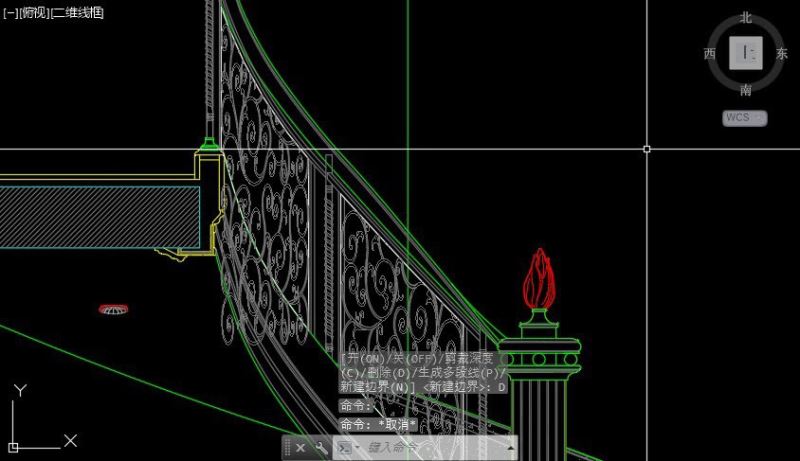 选择栏杆中的一段铁花,查看裁剪的边界,输入XCLIP,回车,输入D,回车,将边界删除,看看原始图块是什么样的。