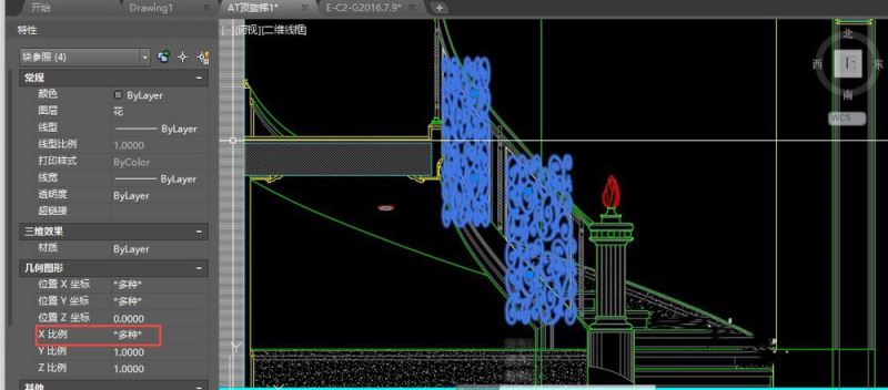2、将栏杆的四个图块的裁剪边界都删除,选中这四个图块,在特性面板中查看一下属性,我们发现,上面和下面的图块是一样的,只是根据宽度修改了一下图块的X轴的比例而已,如图所是。