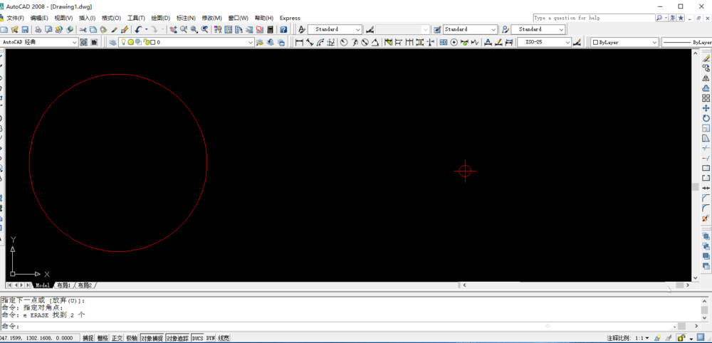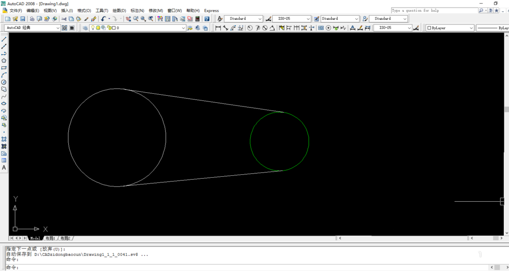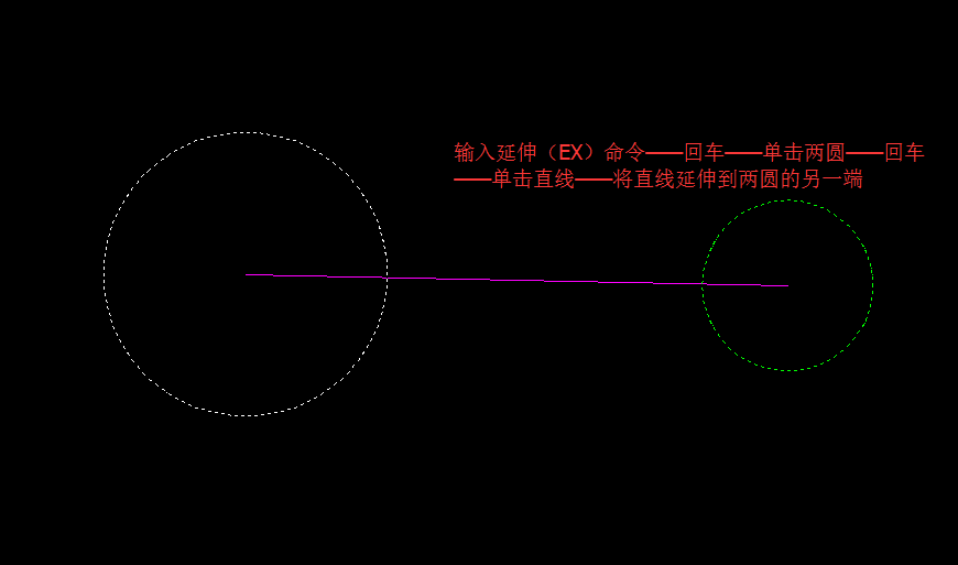 2、输入延伸(EX)命令——空格键——单击选中两圆——空格键——单击直线两端将其延伸至两圆的另一端——空格键确认