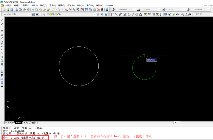 1、输入直线(L)命令,紧接着在命令行输入“tan"命令,捕捉到一个圆的切点,单击选中切点