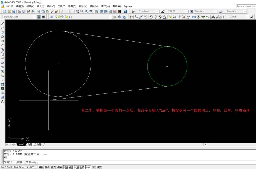 2、捕捉到一个圆的一点后,在命令行输入“tan”,捕捉到另一个圆的切点,单击,空格键,完成操作
