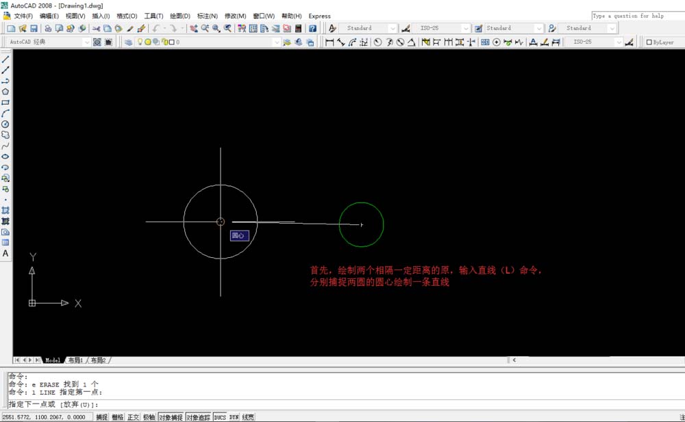 1、首先画两个一定距离的圆,输入直线(L)命令——分别捕捉两圆的圆心,画一条直线