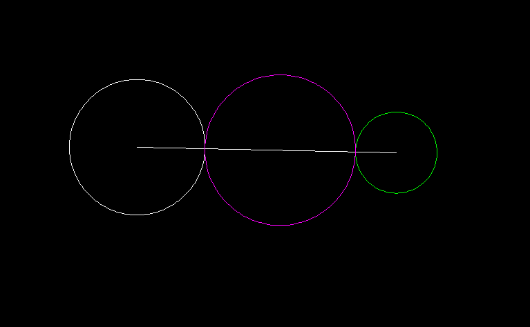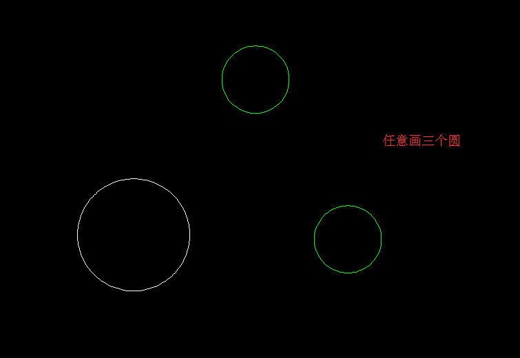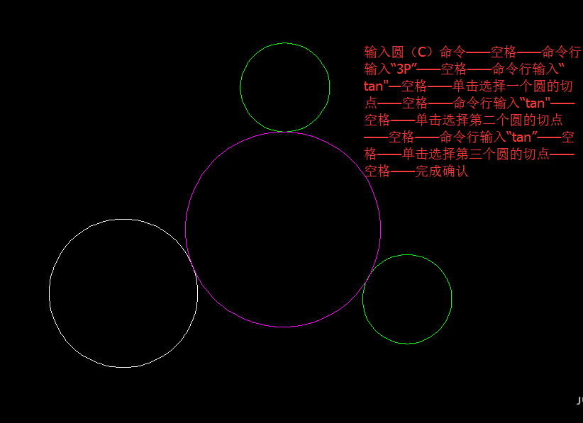 2、输入圆(C)命令——空格——命令行输入“3P”——空格——命令行输入“tan"—空格——单击选择一个圆的切点——空格——命令行输入“tan"——空格——单击选择第二个圆的切点——空格——命令行输入“tan”——空格——单击选择第三个圆的切点——空格——完成确认