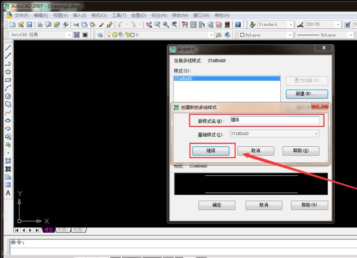5、如图所示,设置新样式名称,这里设置为“墙体”,然后单击“继续”;